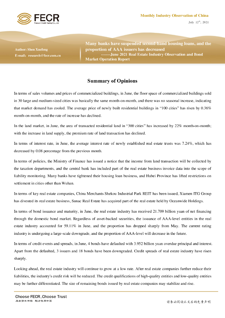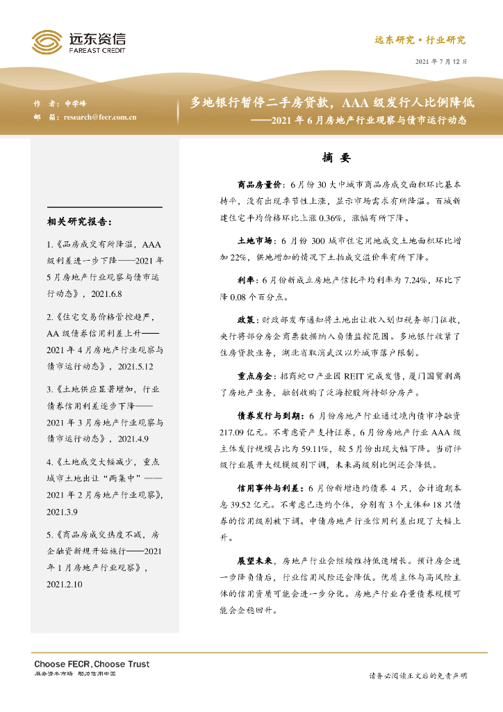 远东资信:多地银行暂停二手房贷款,AAA级发行人比例降低——2021年6月房地产行业观察与债市运行动态.pdf