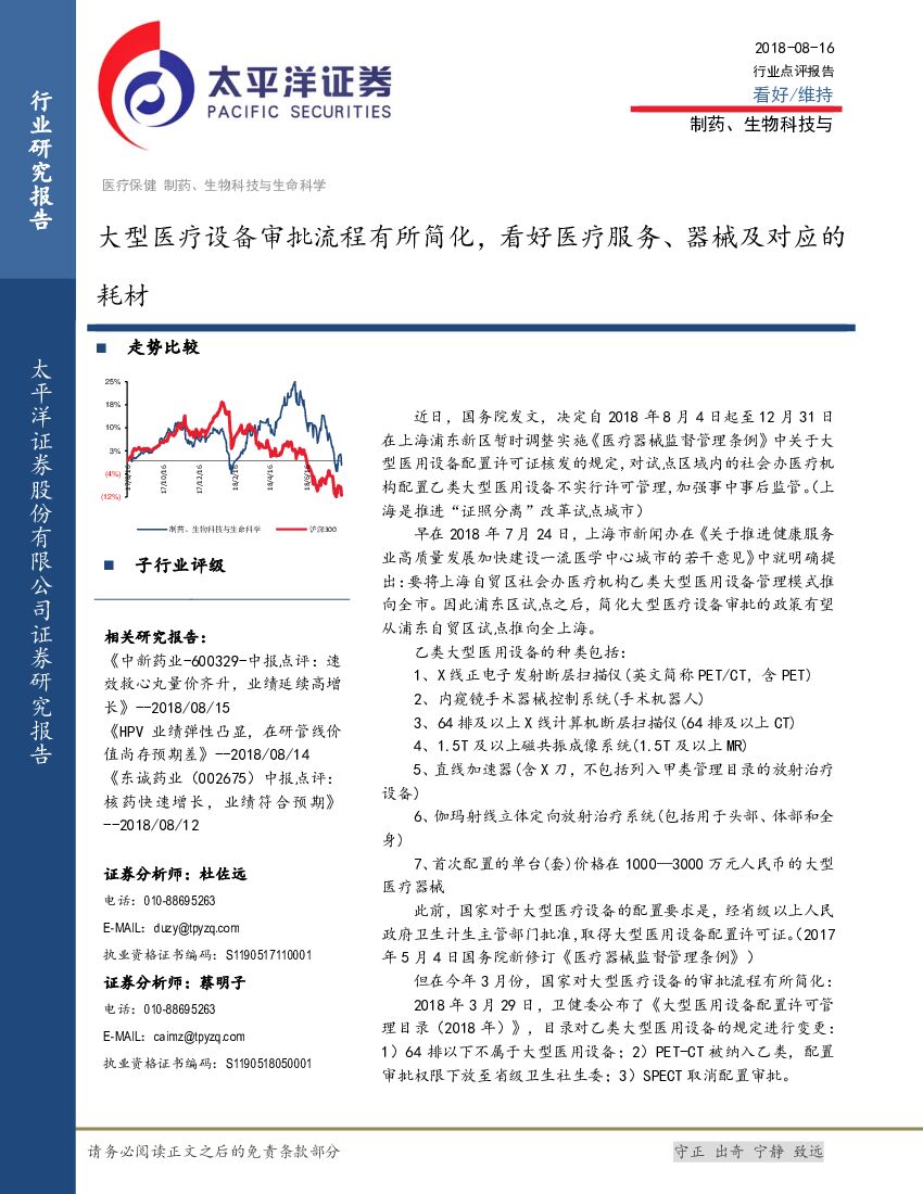 太平洋证券:制药、生物科技与生命科学行业点评报告:大型医疗设备审批流程有所简化,看好医疗服务、器械及对应的耗材.pdf