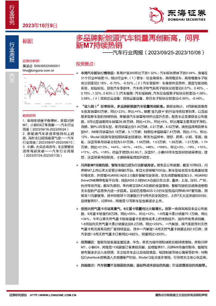 东海证券:汽车行业周报:多品牌新能源汽车销量再创新高,问界新M7持续热销.pdf