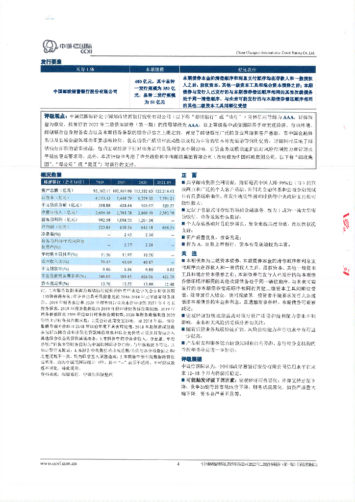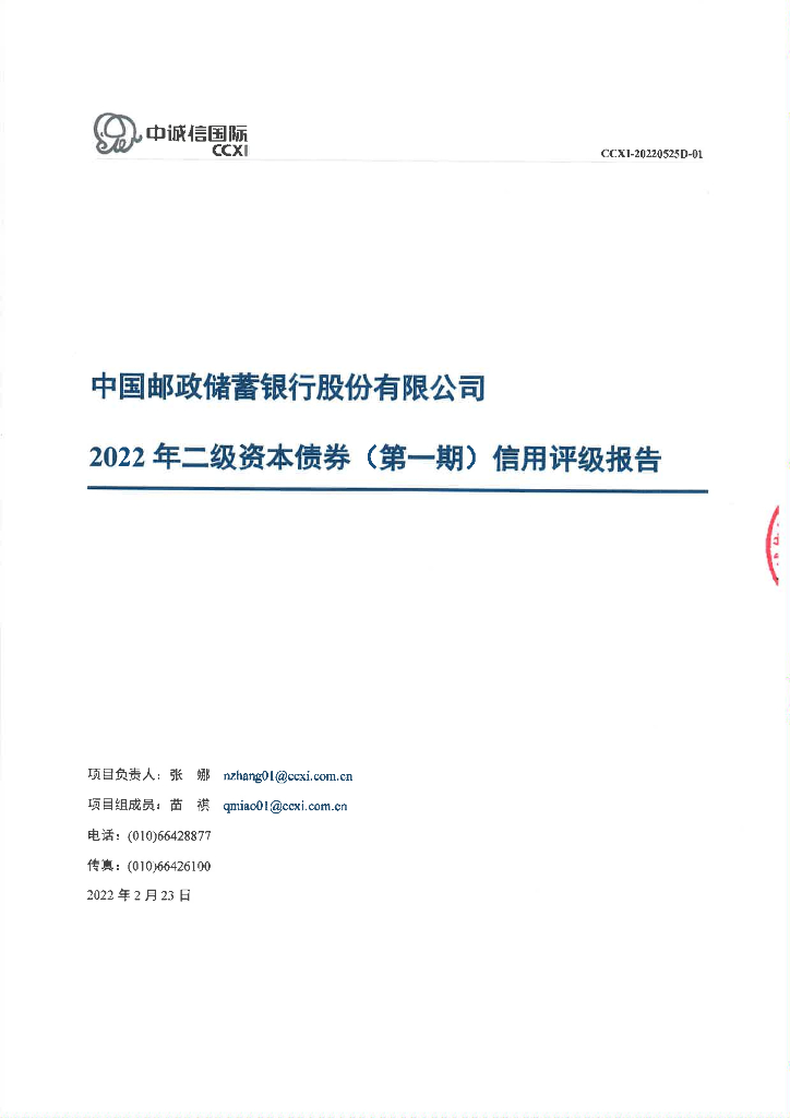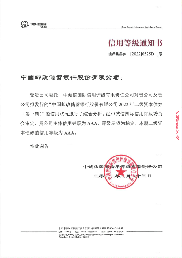 中诚信:中国邮政储蓄银行股份有限公司2022年二级资本债券(第一期)信用评级报告及跟踪评级安排的说明.pdf