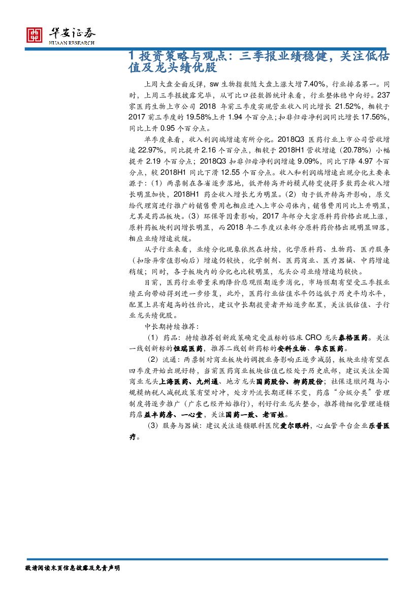 华安证券:医药生物行业周报:三季报业绩稳健,关注低估值及龙头绩优股.pdf
