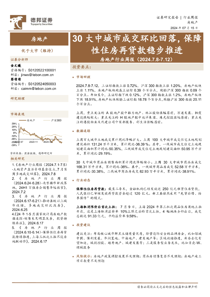 德邦证券:房地产行业周报:30大中城市成交环比回落,保障性住房再贷款稳步推进.pdf