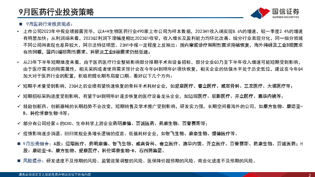 国信证券:医药生物行业2023年9月投资策略暨2023年中报总结:复苏与分化兼具,积极把握长期布局窗口.pdf