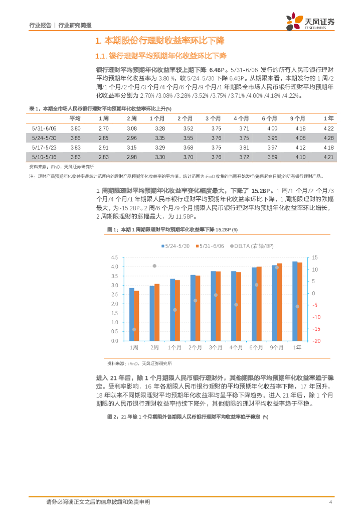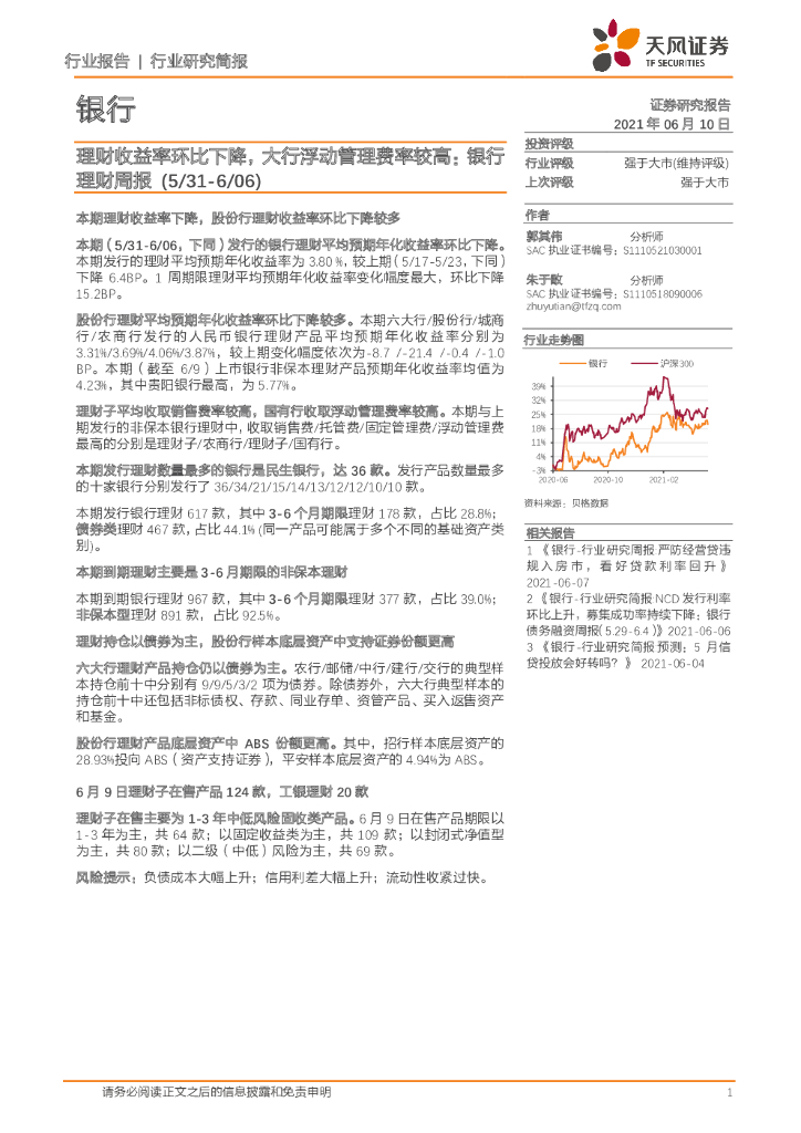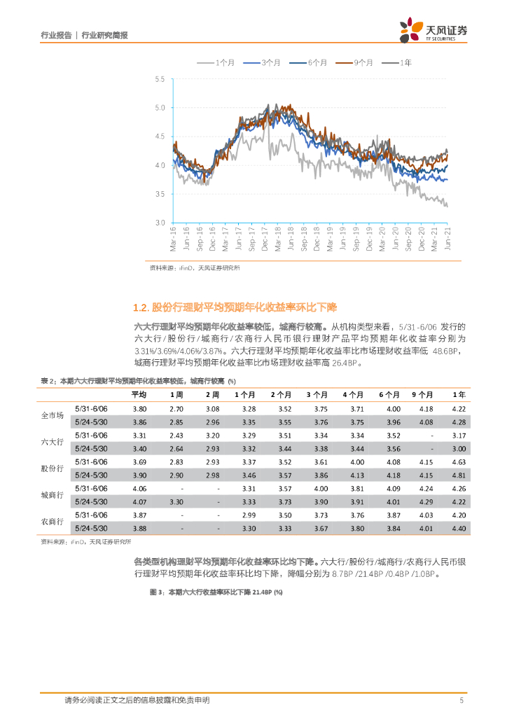 天风证券:银行理财周报:理财收益率环比下降,大行浮动管理费率较高.pdf