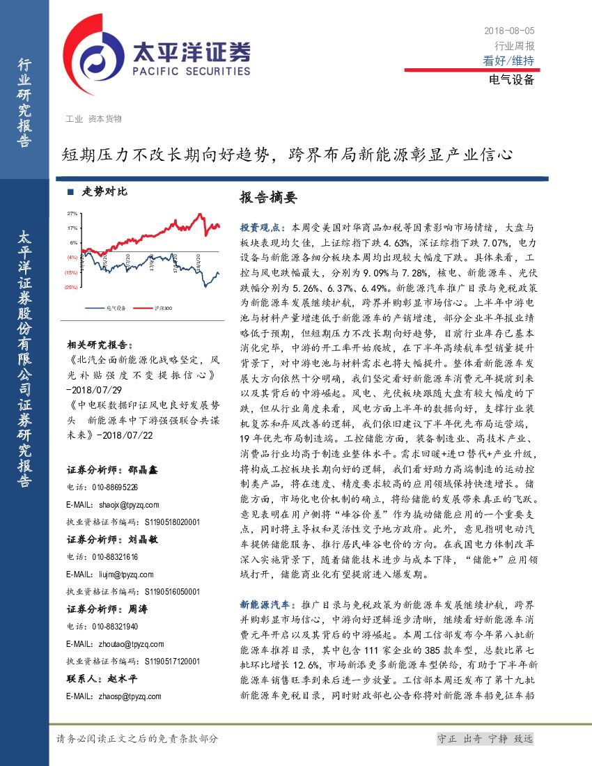 太平洋证券:电气设备行业周报:短期压力不改长期向好趋势,跨界布局新能源彰显产业信心.pdf