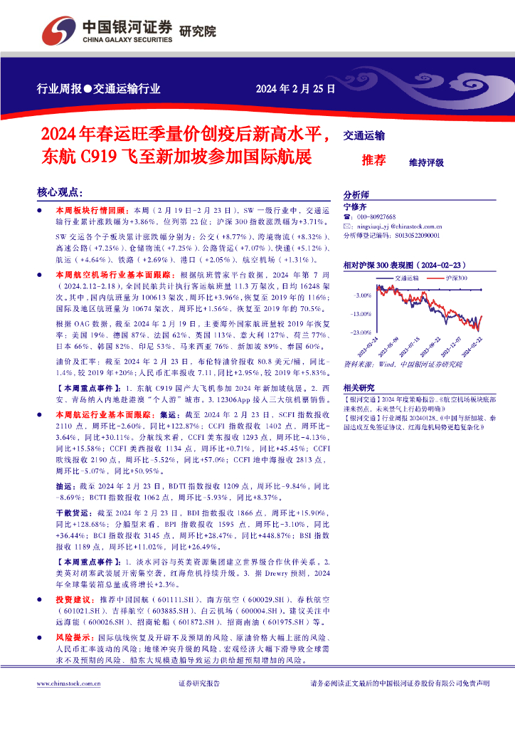 中国银河:交通运输行业周报:2024年春运旺季量价创疫后新高水平,东航C919飞至新加坡参加国际航展.pdf