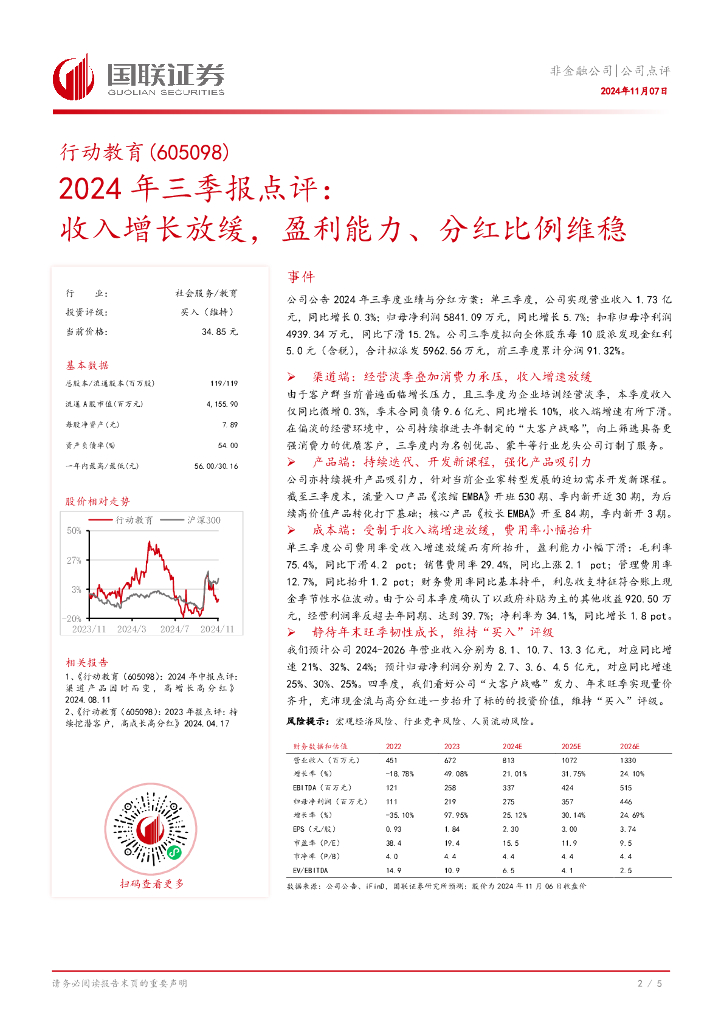 国联证券:行动教育(605098)-2024年三季报点评:收入增长放缓,盈利能力、分红比例维稳.pdf
