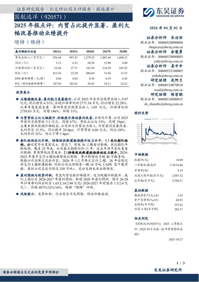 东吴证券:国航远洋(920571)-2025年报点评:内贸占比提升显著,盈利大幅改善推动业绩提升.pdf