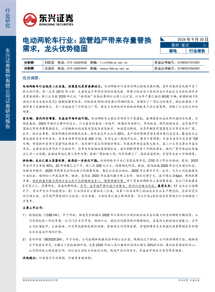 东兴证券:电动两轮车行业:监管趋严带来存量替换需求,龙头优势稳固.pdf