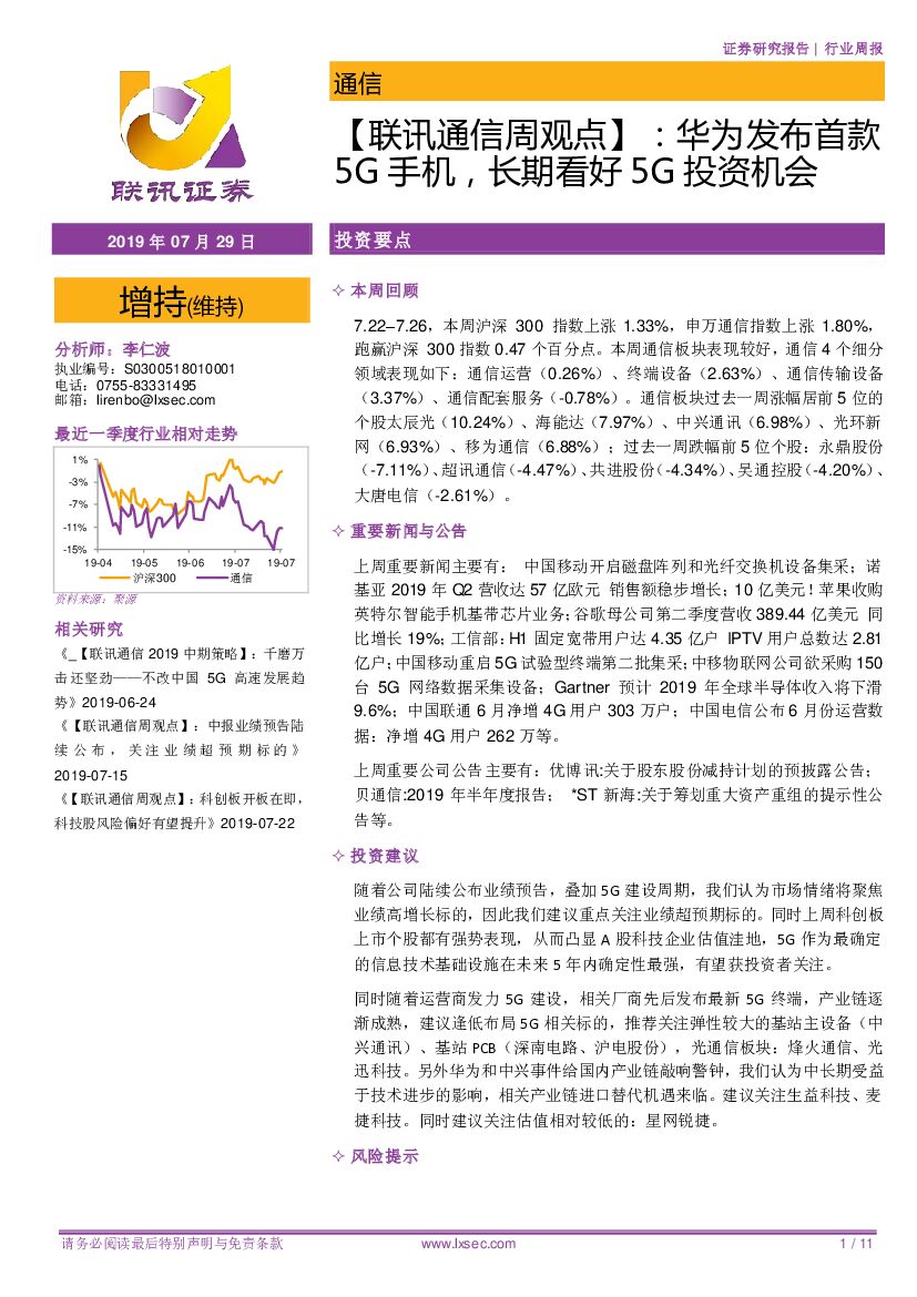 联讯证券:【联讯通信周观点】:华为发布首款5G手机,长期看好5G投资机会.pdf