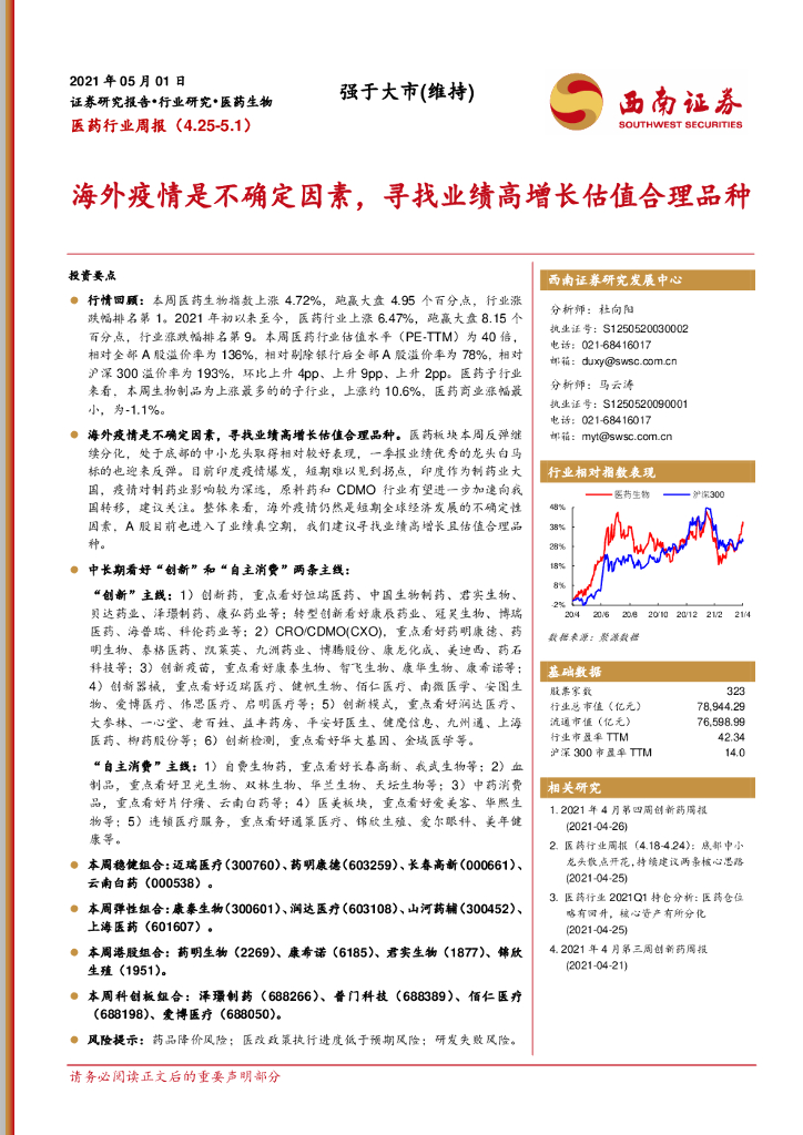 西南证券:医药行业周报:海外疫情是不确定因素,寻找业绩高增长估值合理品种.pdf