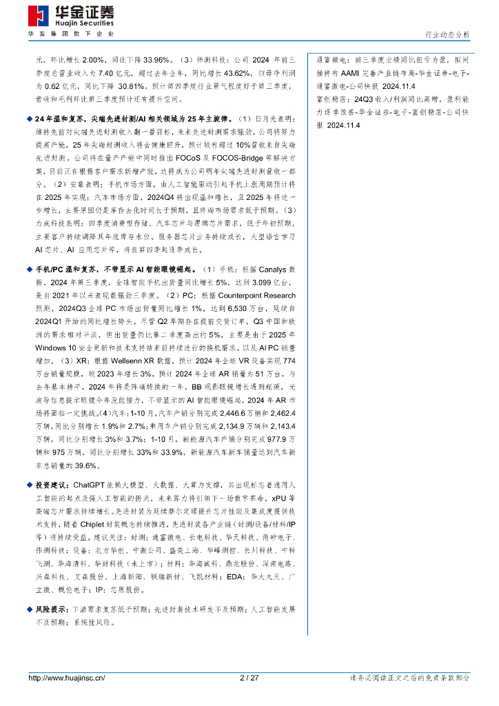华金证券:封测板块Q3总结:前三季度业绩同比改善,尖端先进封测/AI相关或为25年主旋律.pdf
