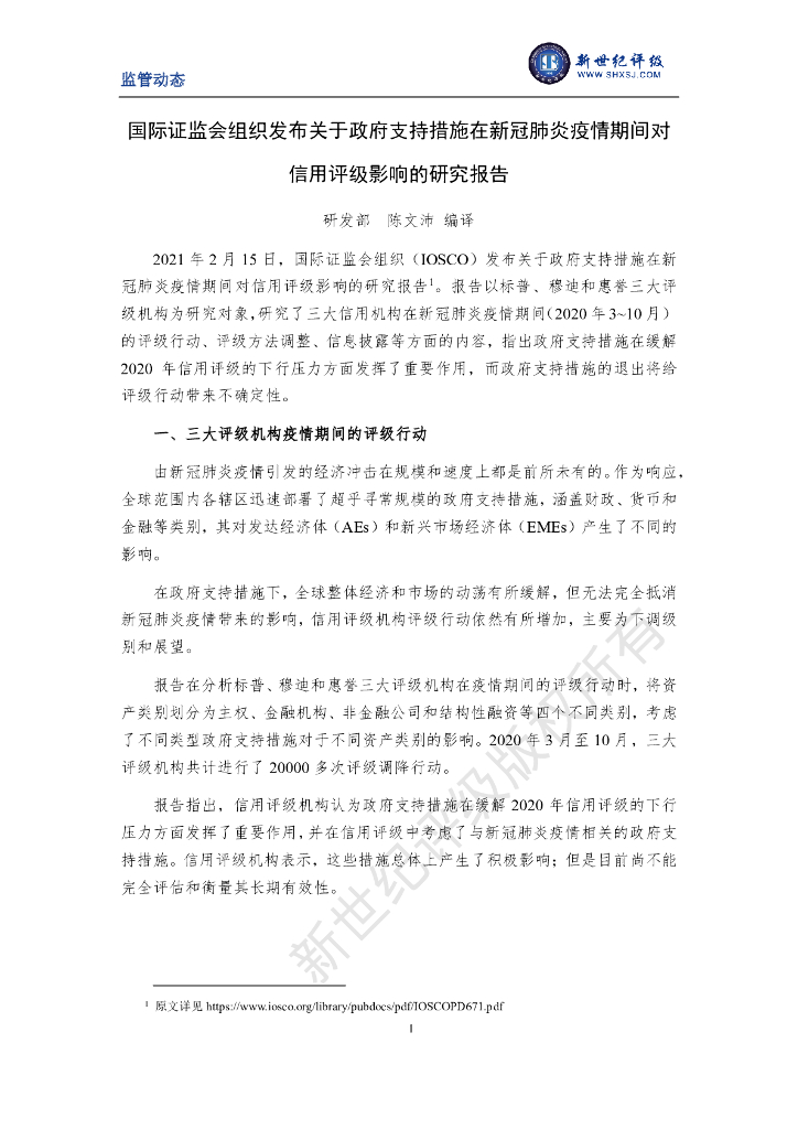 新世纪评级:国际证监会组织发布关于政府支持措施在新冠肺炎疫情期间对信用评级影响的研究报告.pdf
