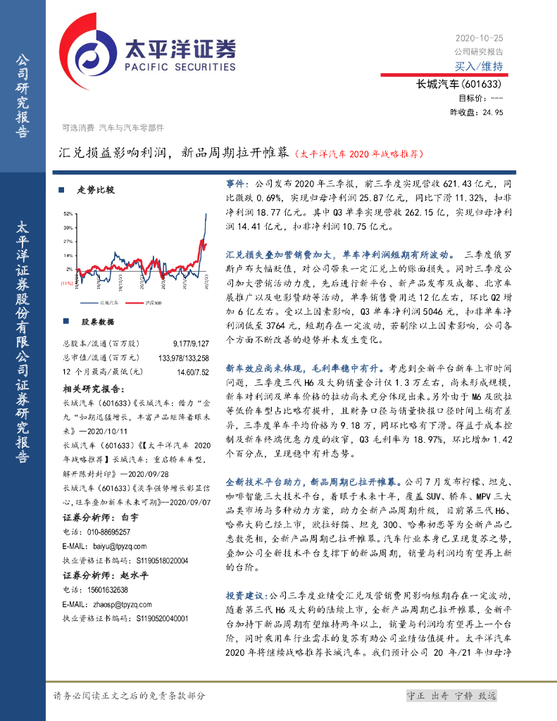 太平洋证券:长城汽车(601633)-汇兑损益影响利润,新品周期拉开帷幕(太平洋汽车2020年战略推荐).pdf