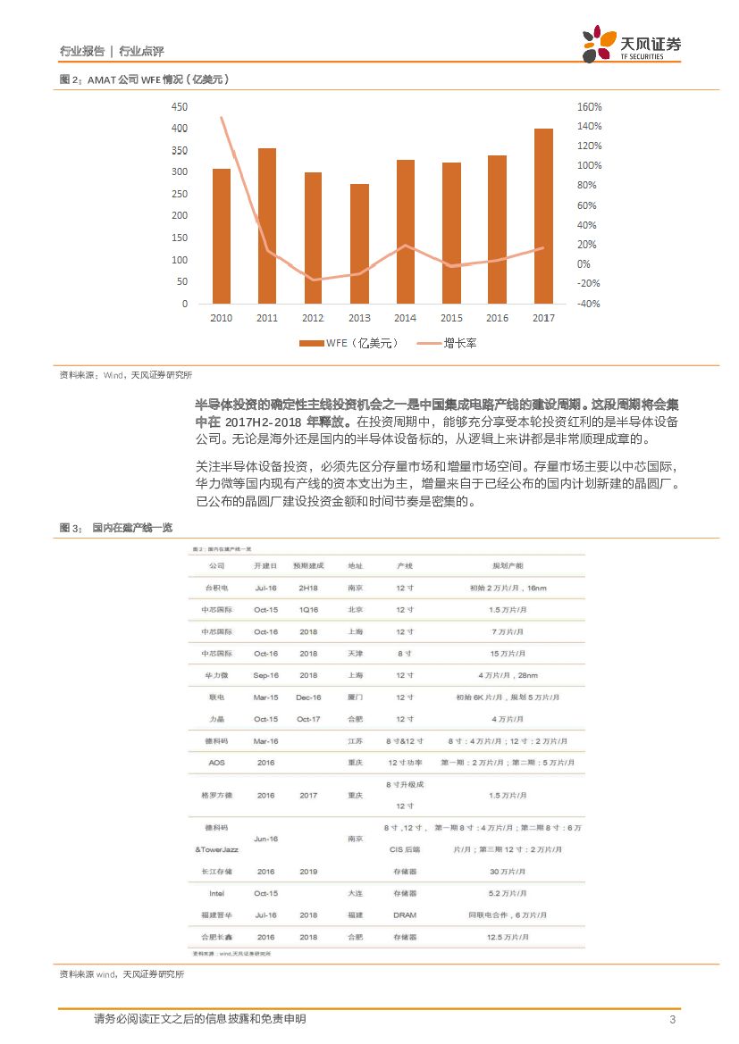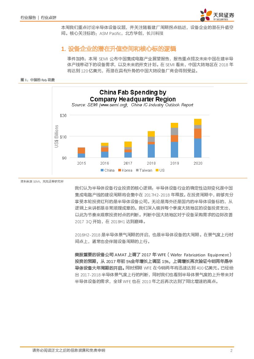 天风证券:电子制造:一周半导体动向:SEMI上看2018年中国产线投资120亿美元,重点关注随着建厂周期拐点临近,设备企业的潜在升值空间和核心标的逻辑.pdf