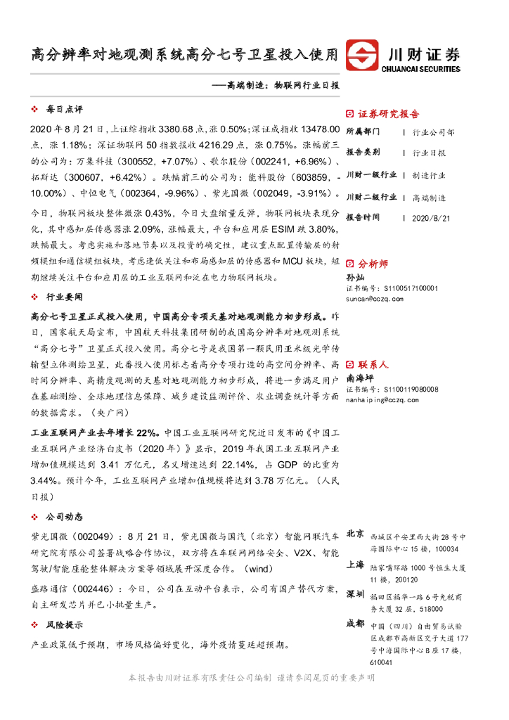 川财证券:高端制造:物联网行业日报:高分辨率对地观测系统高分七号卫星投入使用.pdf