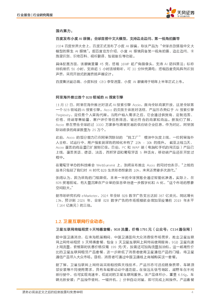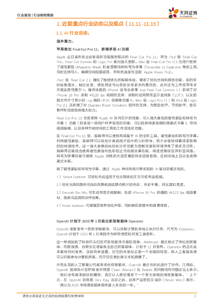 天风证券:通信行业研究周报:苹果推出FinalCutPro11;OpenAI25年1月推出新智能体Operater;百度发布AI眼镜.pdf