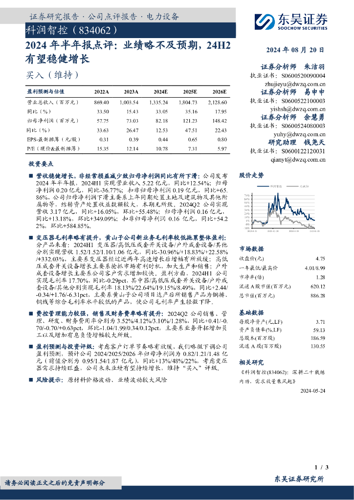 东吴证券:科润智控(834062)-2024年半年报点评:业绩略不及预期,24H2有望稳健增长.pdf