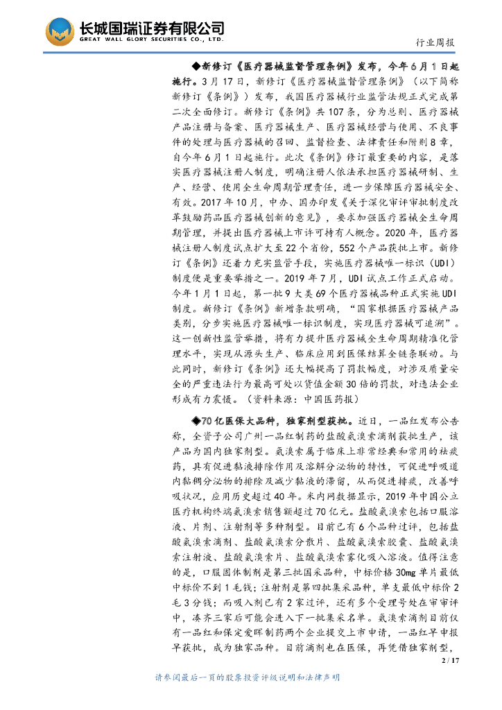 长城国瑞证券:医药生物行业双周报2021年第6期总第30期:第二批鼓励仿制药品目录出炉 新修订《医疗器械监督管理条例》发布.pdf