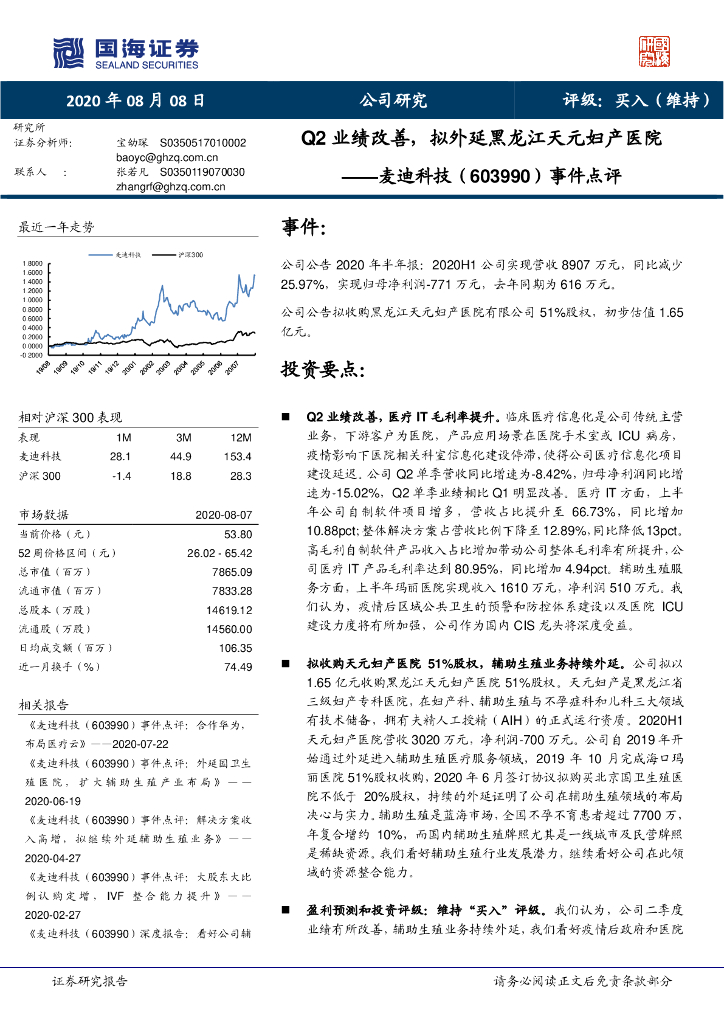 国海证券:麦迪科技(603990)-事件点评:Q2业绩改善,拟外延黑龙江天元妇产医院.pdf