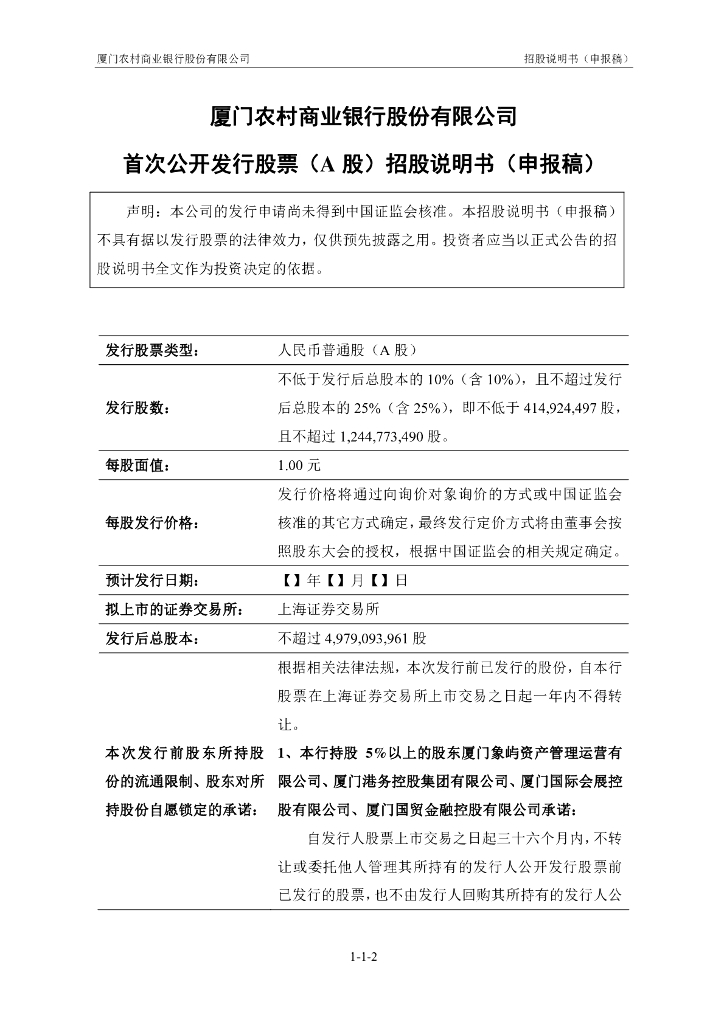 厦门农村商业银行股份有限公司上交所主板IPO上市招股说明书.pdf