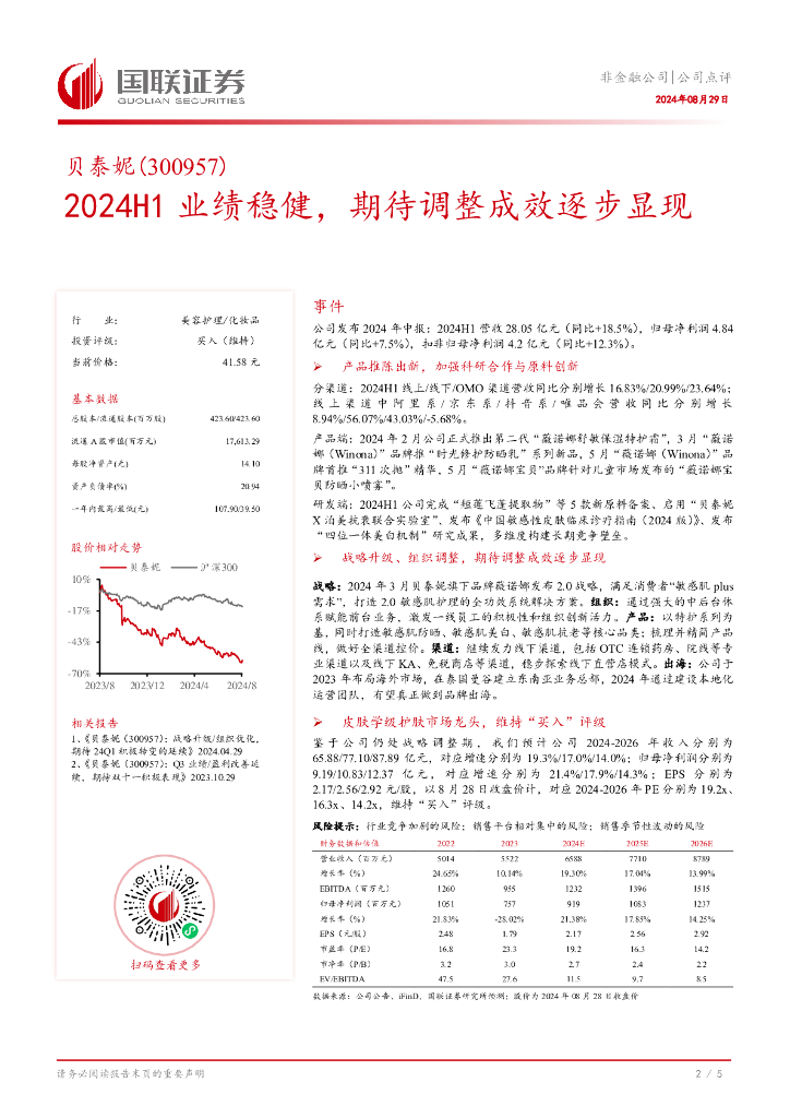 国联证券:贝泰妮(300957)-2024H1业绩稳健,期待调整成效逐步显现.pdf