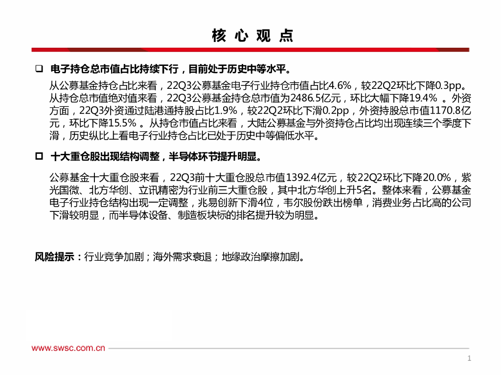 西南证券:电子行业2022Q3基金持仓分析:持仓占比回落,关注结构性机会.pdf