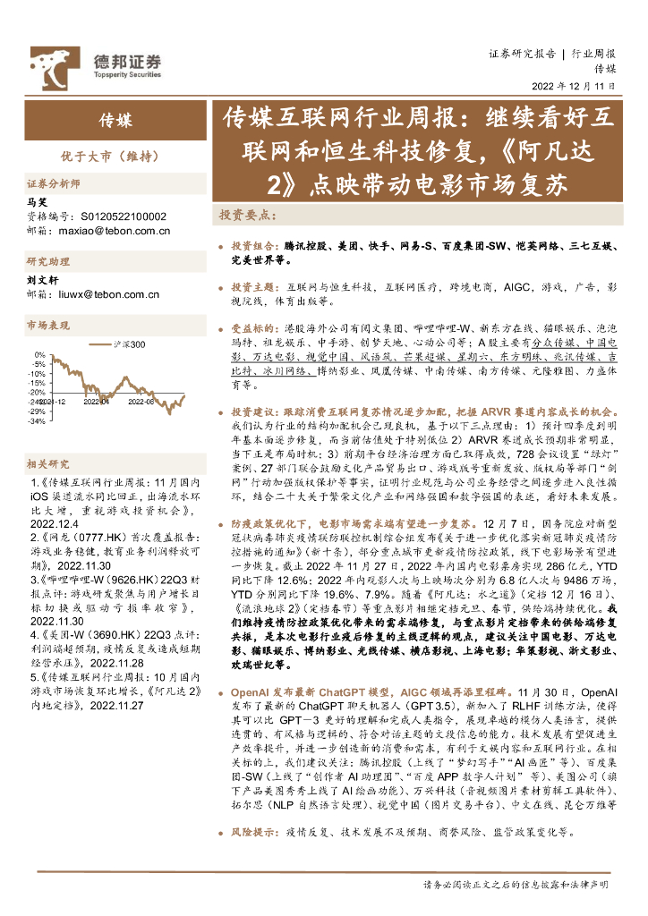 德邦证券:传媒互联网行业周报:继续看好互联网和恒生科技修复,《阿凡达2》点映带动电影市场复苏.pdf