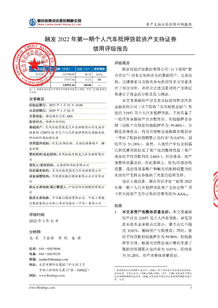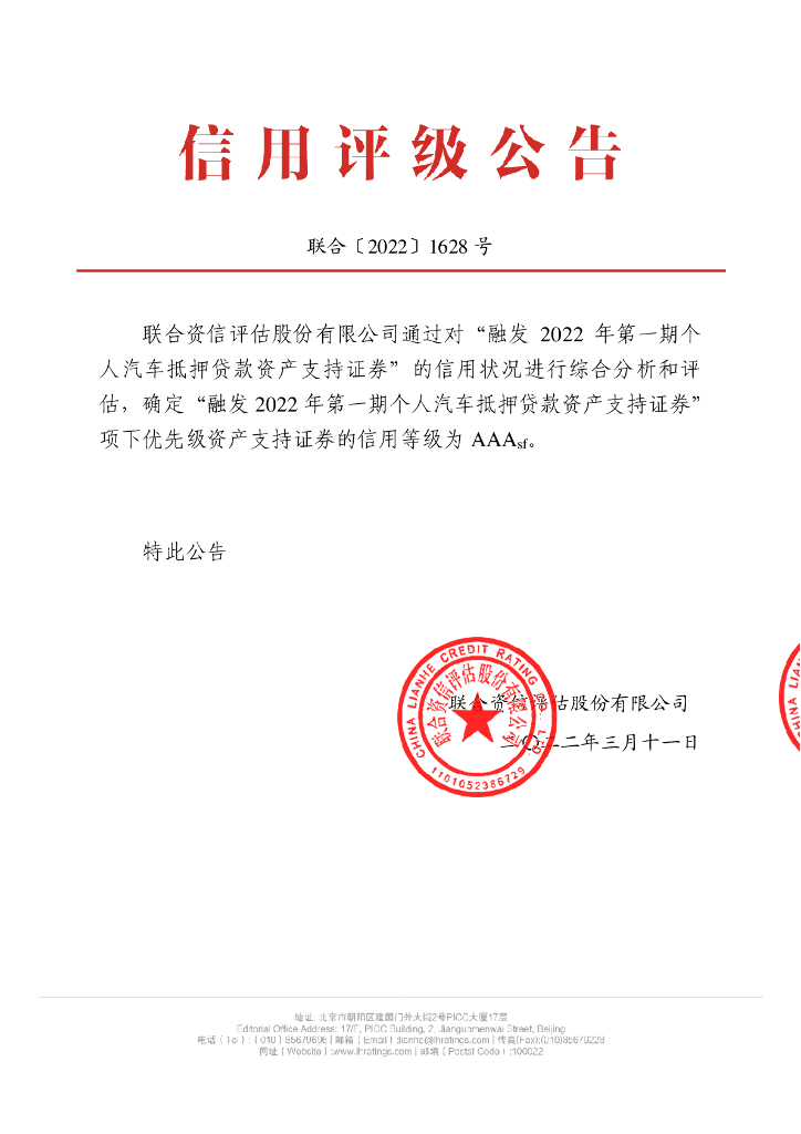 联合资信:融发2022年第一期个人汽车抵押贷款资产支持证券售前评级报告及持续跟踪评级说明.pdf