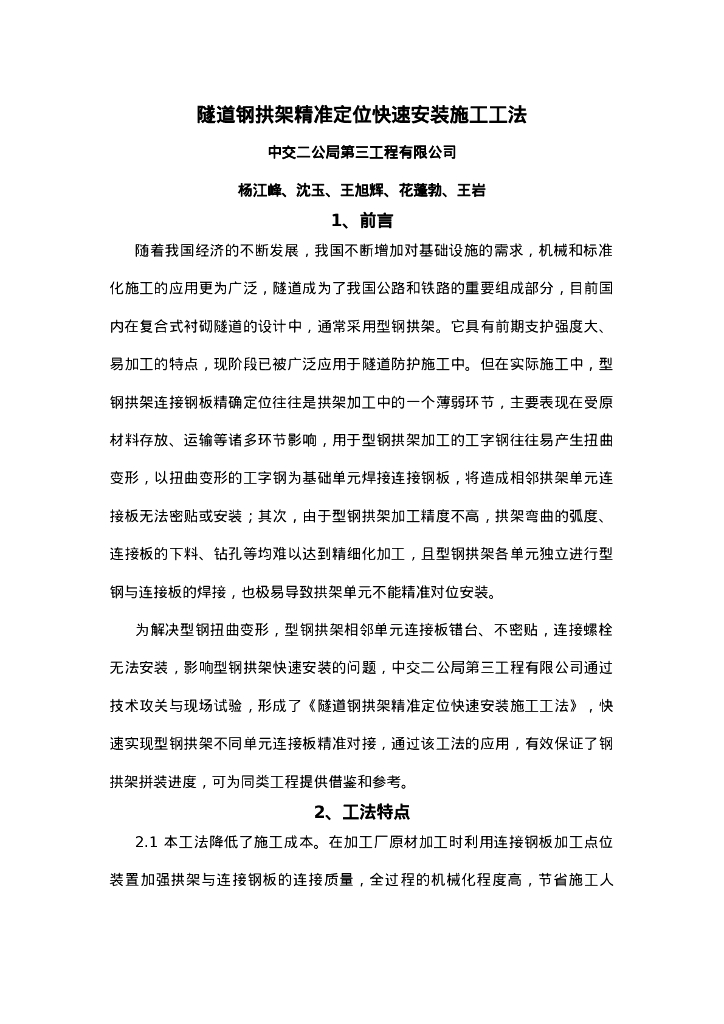 QHGF-2022006 隧道钢拱架精准定位快速安装施工工法法).doc