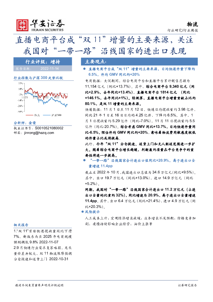 华安证券:物流行业周报:直播电商平台成“双11”增量的主要来源,关注我国对“一带一路”沿线国家的进出口表现.pdf