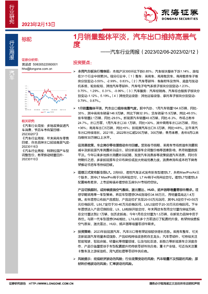 东海证券:汽车行业周报:1月销量整体平淡,汽车出口维持高景气度.pdf