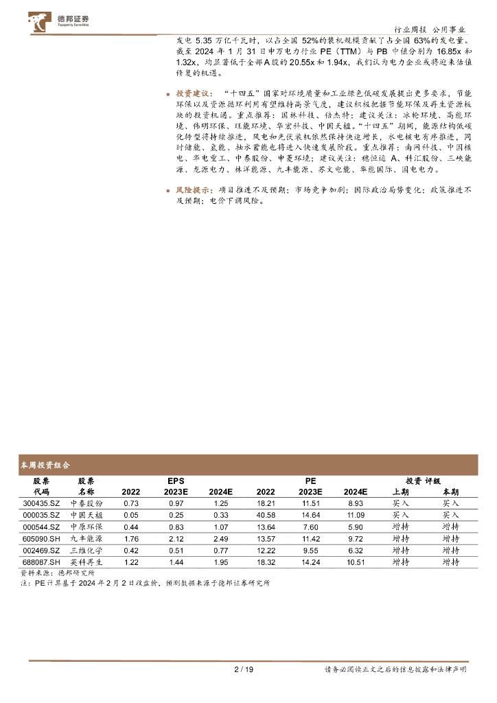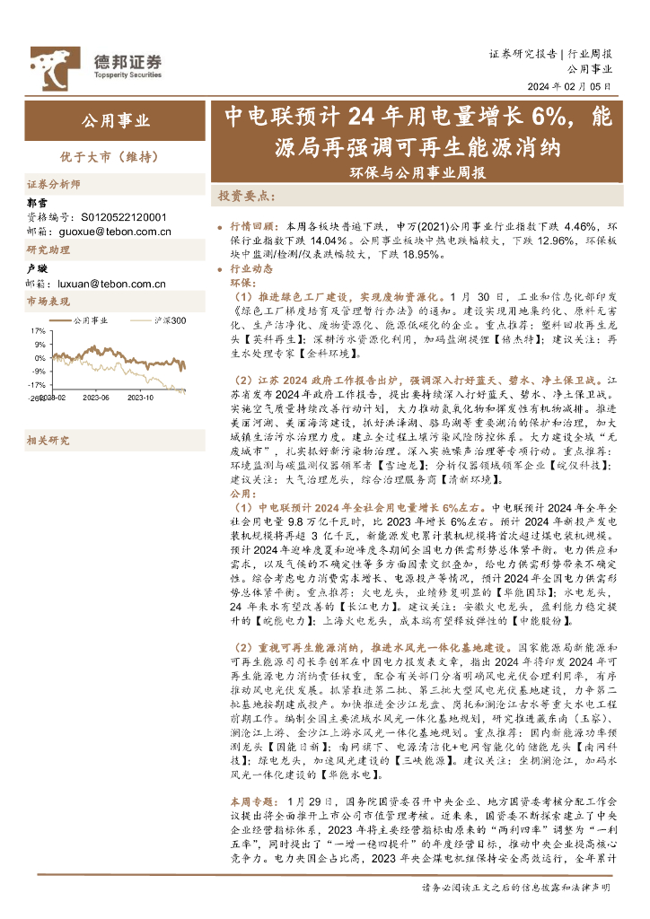 德邦证券:环保与公用事业周报:中电联预计24年用电量增长6%,能源局再强调可再生能源消纳.pdf