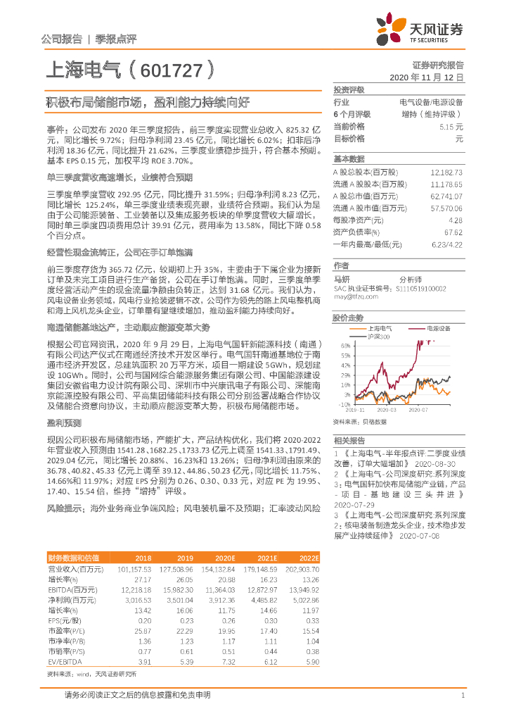 天风证券:上海电气(601727)-积极布局储能市场,盈利能力持续向好.pdf
