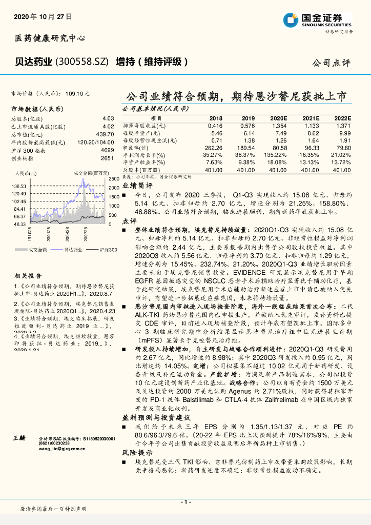 国金证券:贝达药业(300558)-公司业绩符合预期,期待恩沙替尼获批上市.pdf
