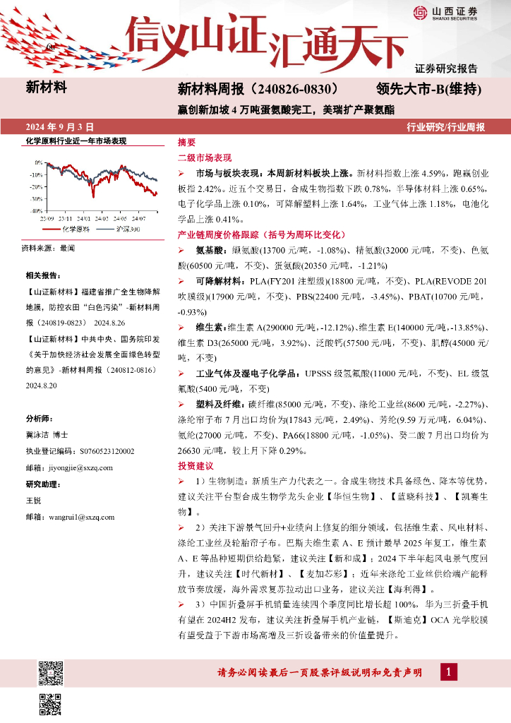 山西证券:新材料行业周报:新材料周报(240826-0830)赢创新加坡4万吨蛋氨酸完工,美瑞扩产聚氨酯.pdf