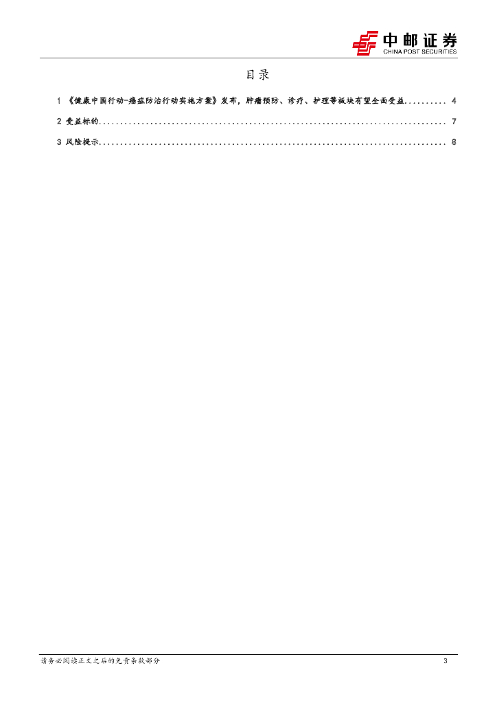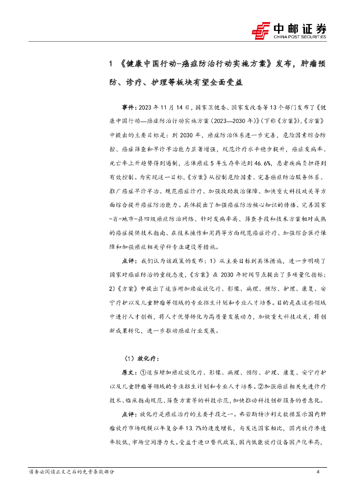 中邮证券:医药生物点评报告:《健康中国行动-癌症防治行动实施方案》发布,肿瘤预防、诊疗、护理等板块有望全面受益.pdf