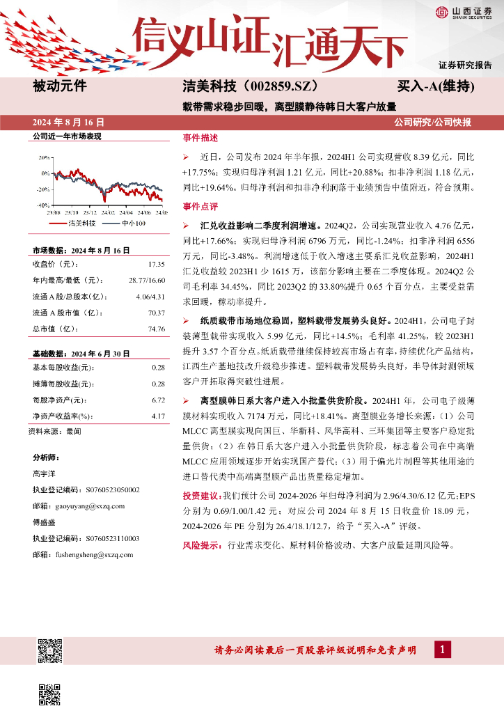 山西证券:洁美科技(002859)-载带需求稳步回暖,离型膜静待韩日大客户放量.pdf