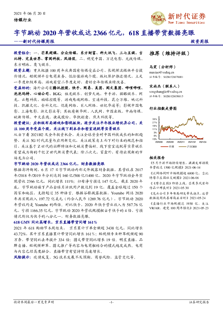 新时代证券:新时代传媒周报:字节跳动2020年营收或达2366亿元,618直播带货数据亮眼.pdf