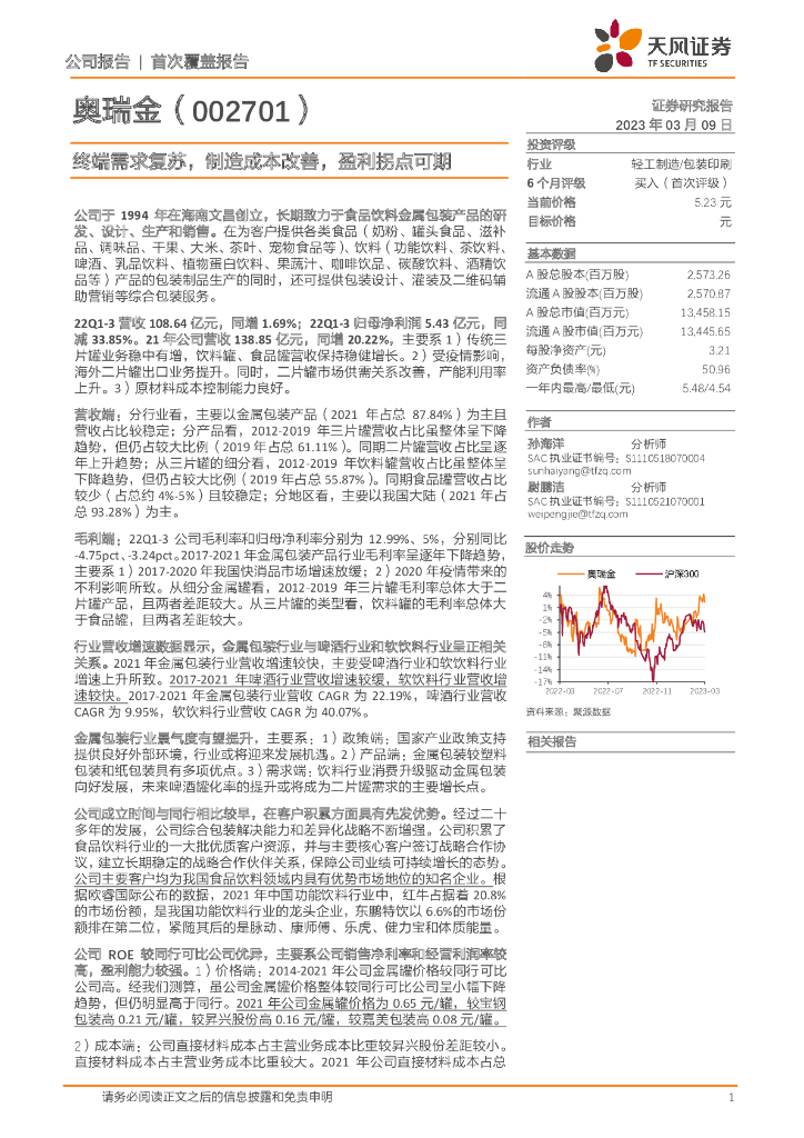 天风证券:奥瑞金(002701)-终端需求复苏,制造成本改善,盈利拐点可期.pdf