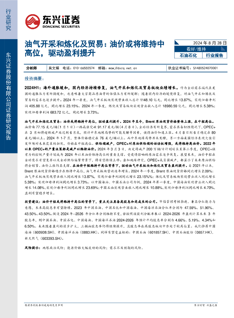 东兴证券:油气开采和炼化及贸易:油价或将维持中高位,驱动盈利提升.pdf