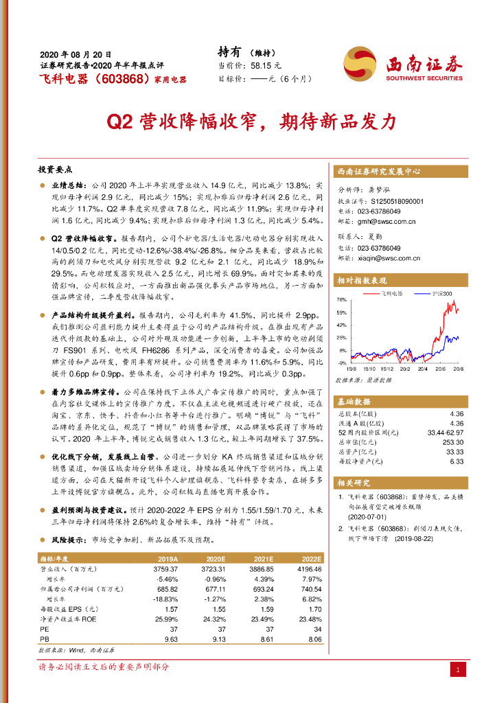 西南证券:飞科电器(603868)-Q2营收降幅收窄,期待新品发力.pdf