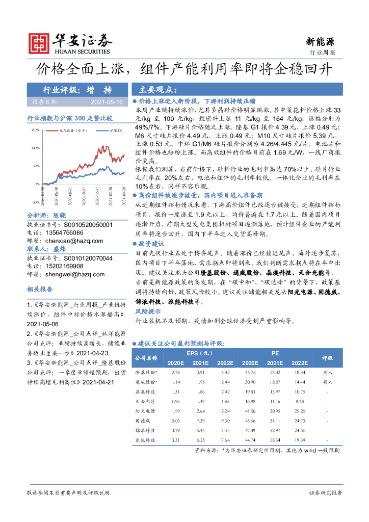 华安证券:新能源行业周报:价格全面上涨,组件产能利用率即将企稳回升.pdf