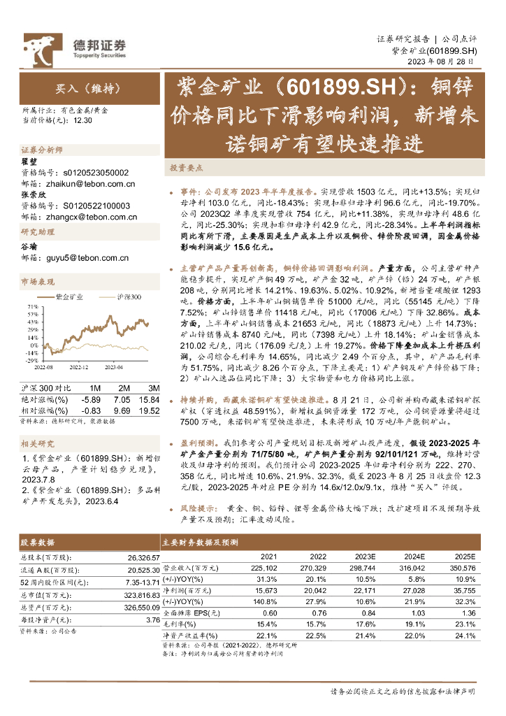 德邦证券:紫金矿业(601899)-铜锌价格同比下滑影响利润,新增朱诺铜矿有望快速推进.pdf