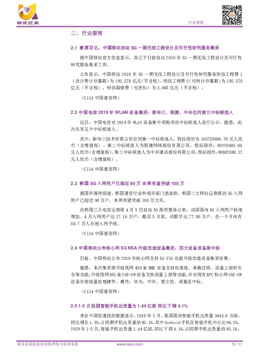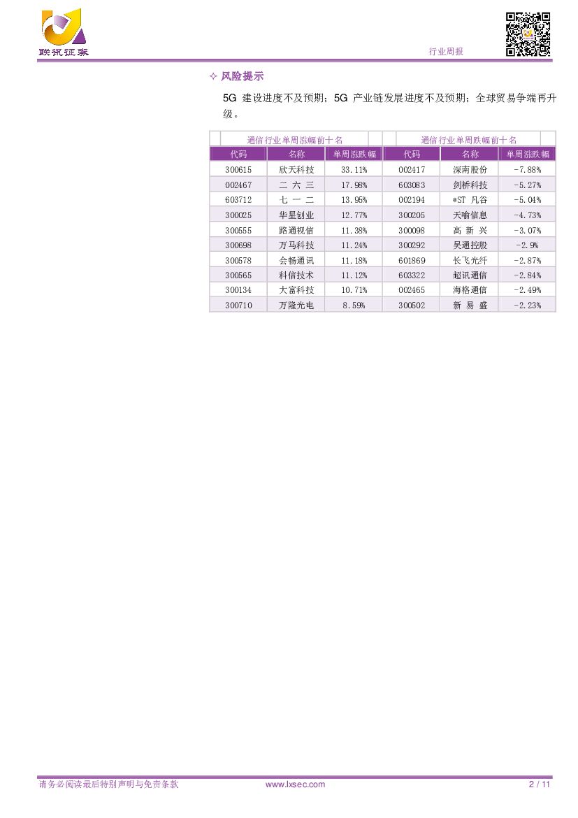 联讯证券:【联讯通信周观点】华为领跑全球5G订单,关注产业链业绩兑现.pdf