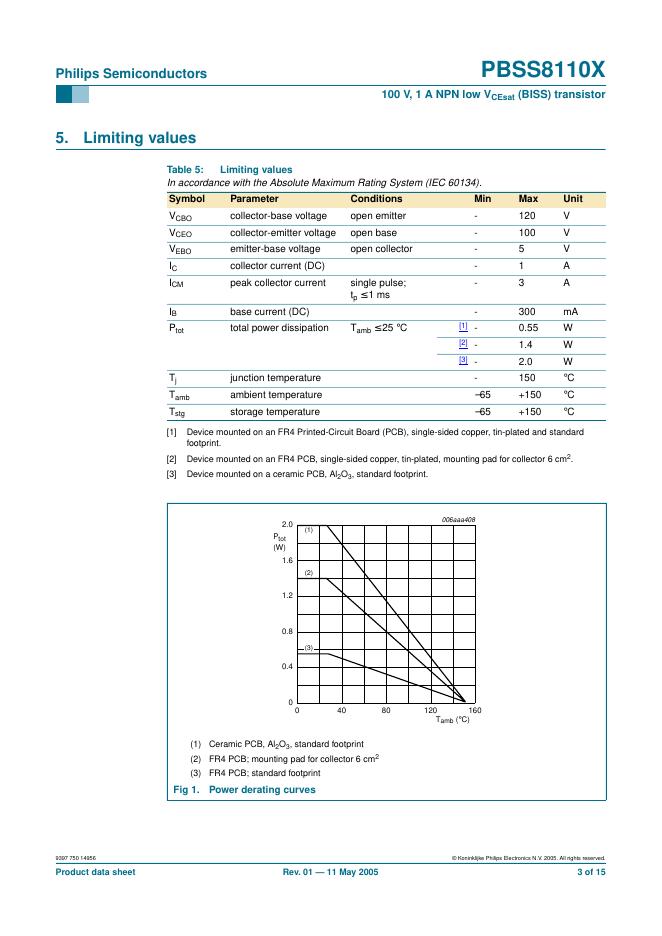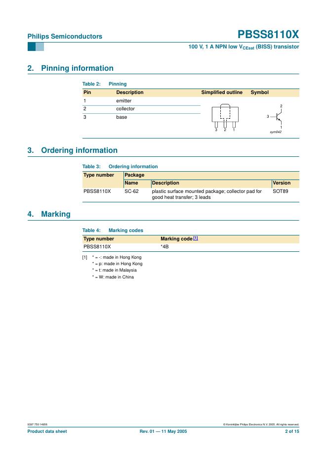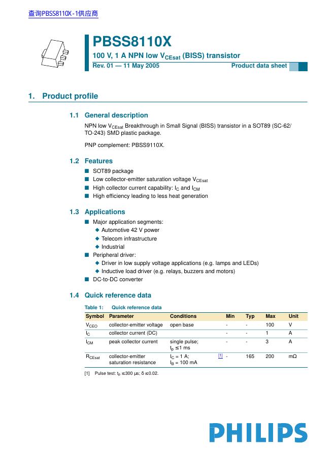 philips PBSS8110X 100 V, 1 A NPN low VCEsat (BISS) transistor 数据手册.pdf