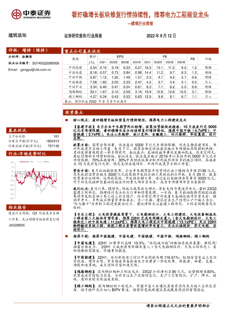 中泰证券:建筑行业周报:看好稳增长板块修复行情持续性,推荐电力工程建设龙头.pdf