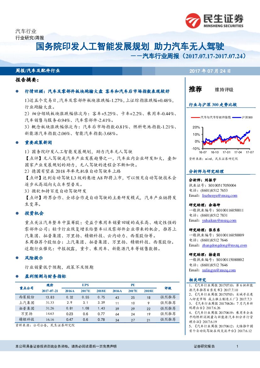 民生证券:汽车行业周报:国务院印发人工智能发展规划 助力汽车无人驾驶.pdf
