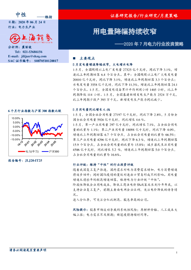 上海证券:2020年7月电力行业投资策略:用电量降幅持续收窄.pdf