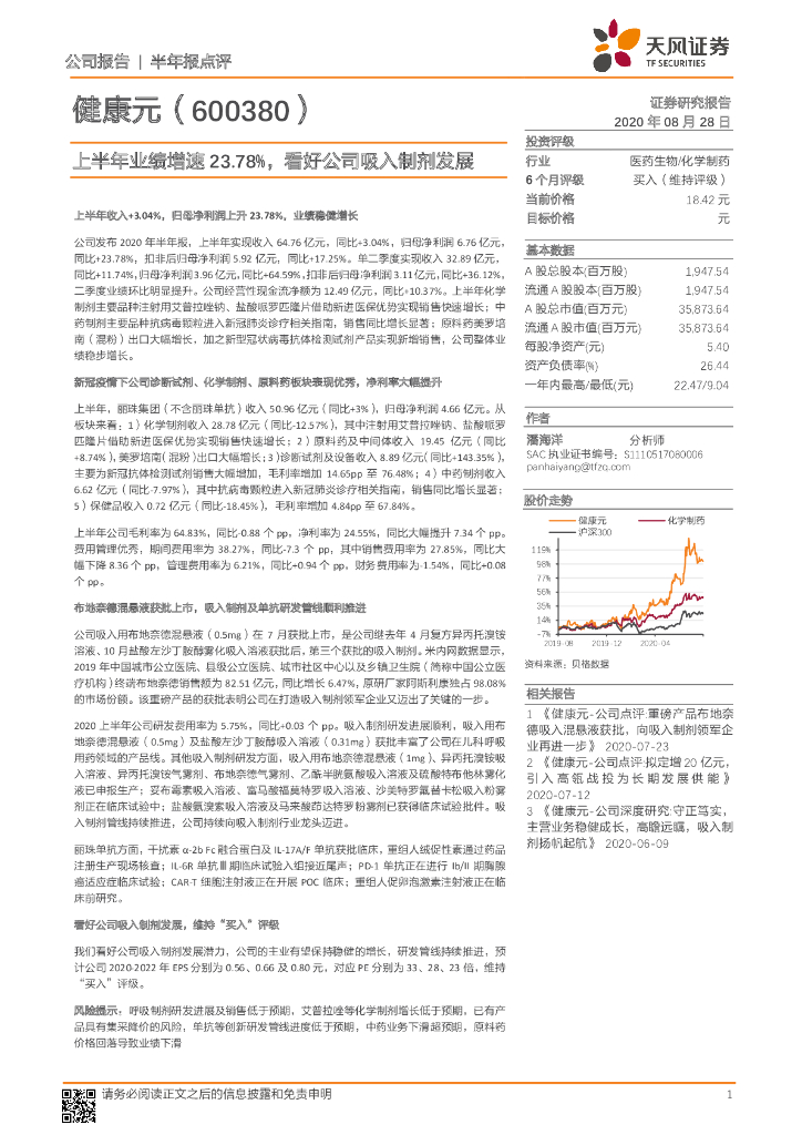 天风证券:健康元(600380)-上半年业绩增速23.78%,看好公司吸入制剂发展.pdf